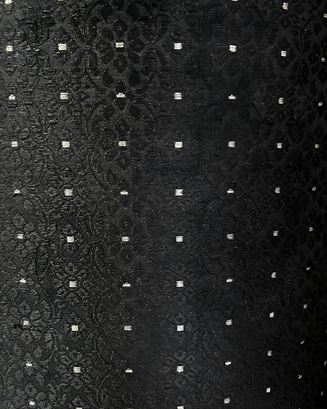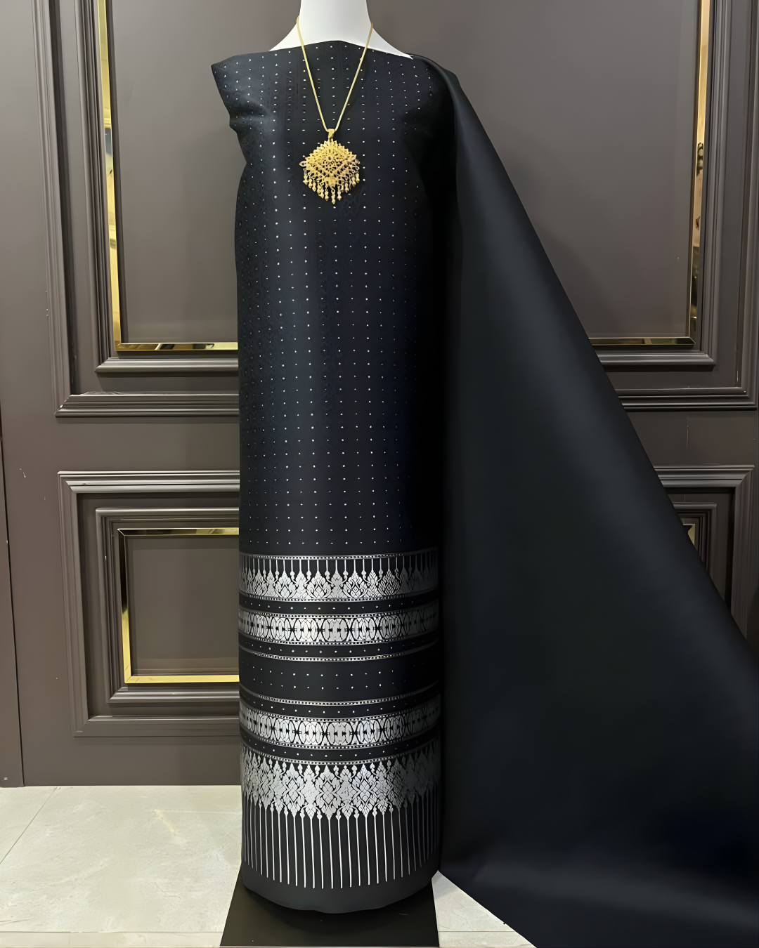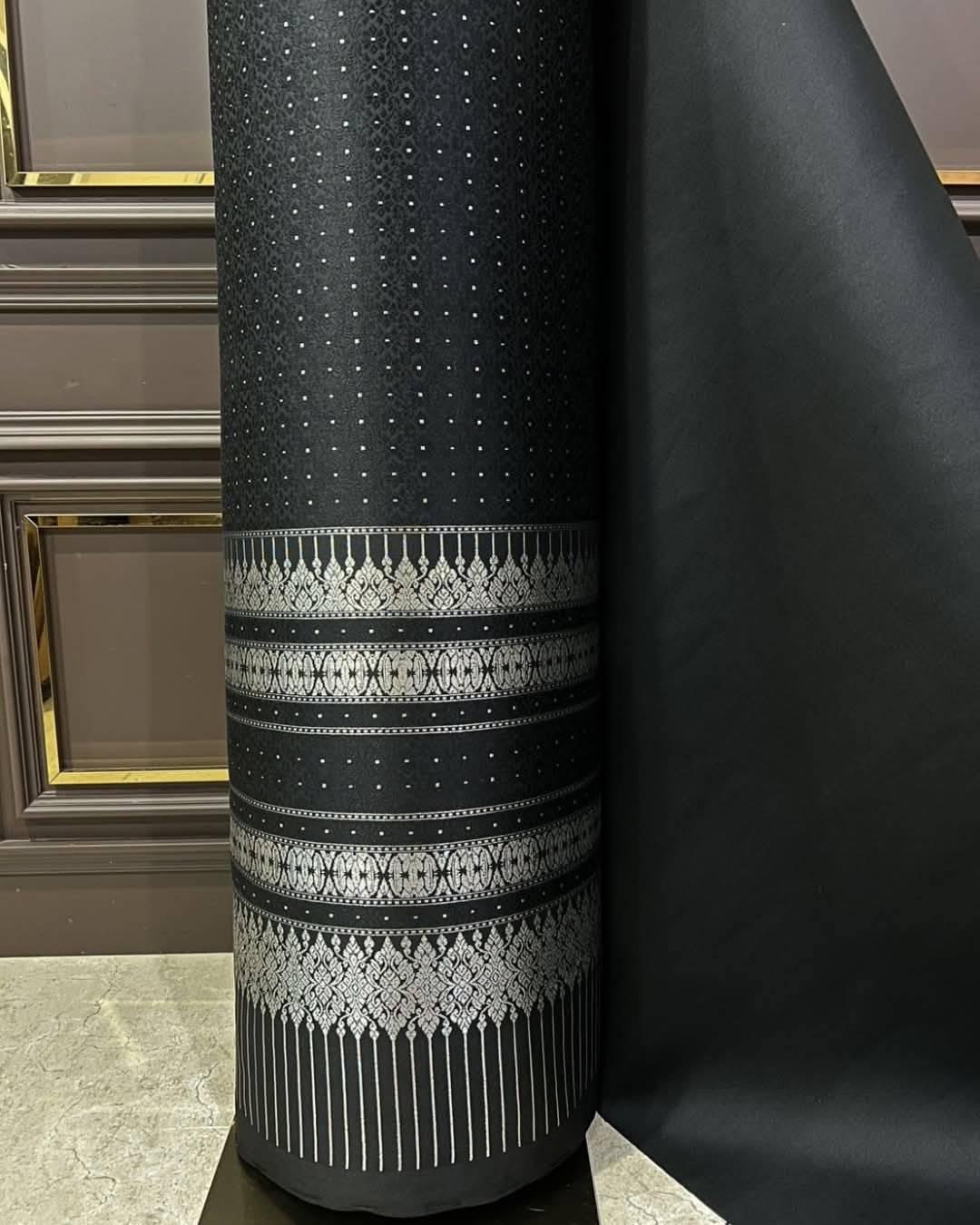 ผ้าไหมยกดอกลำพูนแท้ 100% ขนาด 1.03 x 4.42 เมตร ลวดลาย บัวสวรรค์ ประณีต งดงาม พร้อมเกาะเชิงดิ้นเงินที่ตัดกับพื้นสีดำอย่างลงตัว ลายใหญ่ 25–50 ตะกอ และมี หน้านางครบชุด มาพร้อม ผ้าพื้นและผ้าลาย สำหรับตัดเย็บเป็นชุดไทยเต็มยศ 1 ชุด ผ้าไหมมีความเงางาม นุ่มมือ และคงความสง่างามแบบไทยแท้ เหมาะสำหรับงานพิธีการสำคัญ งานแต่งงาน หรือโอกาสพิเศษที่ต้องการความหรูหราและเป็นเอกลักษณ์